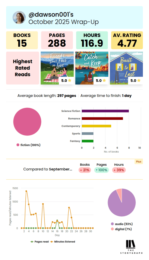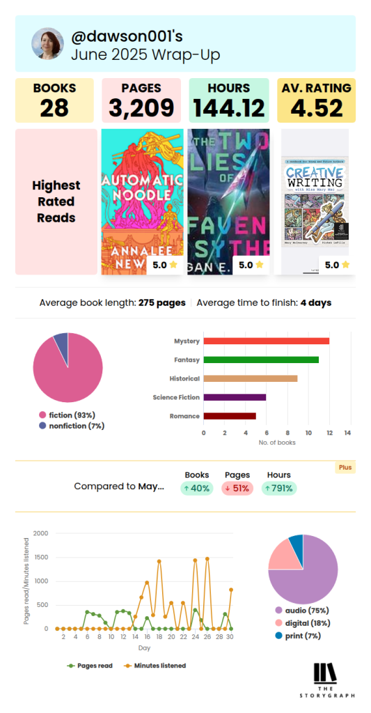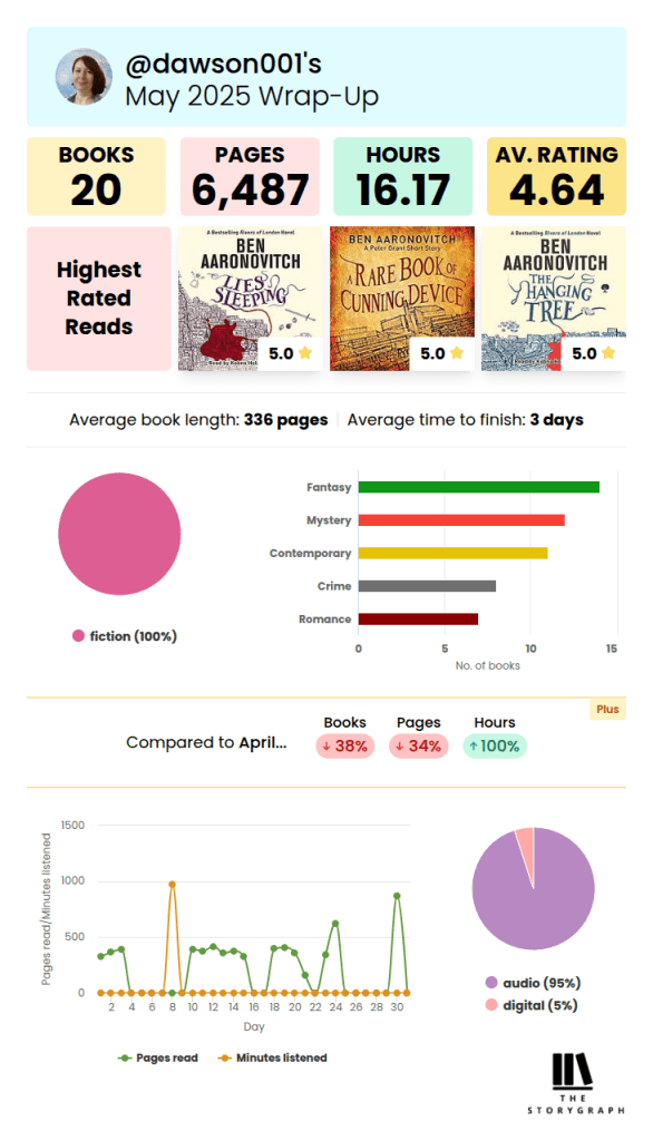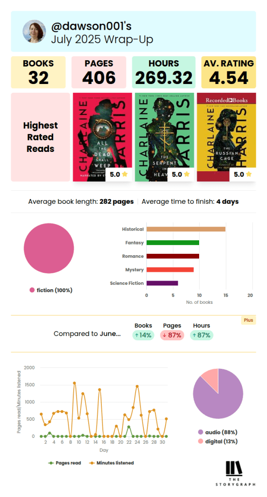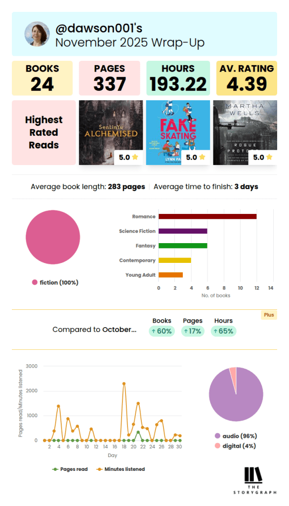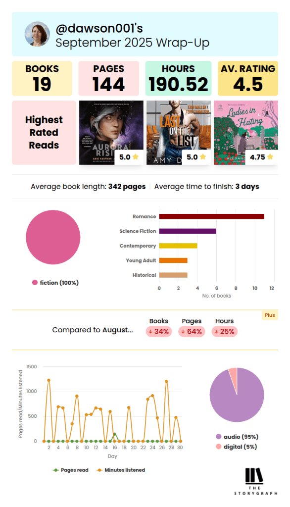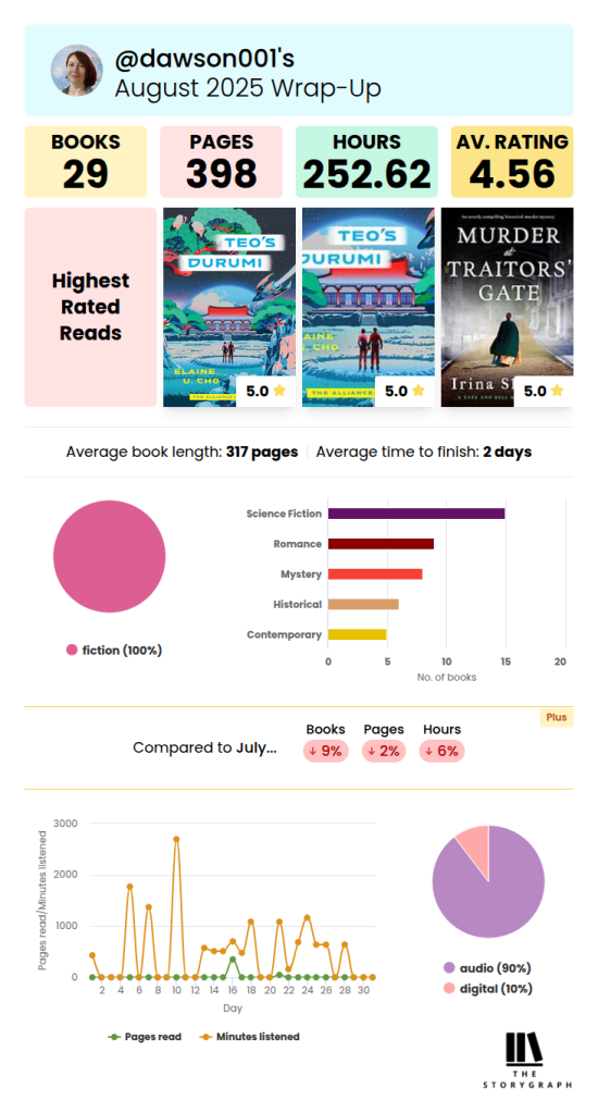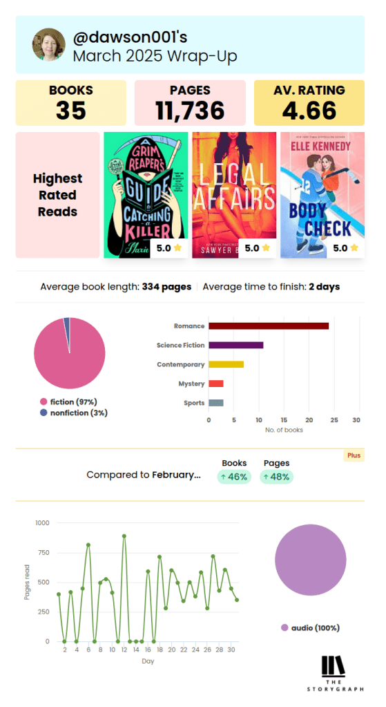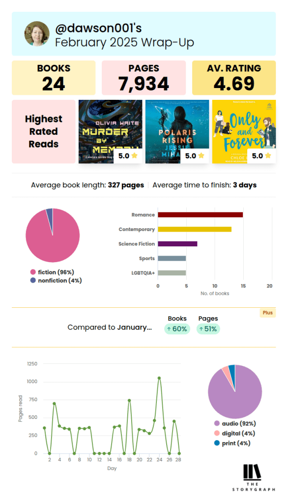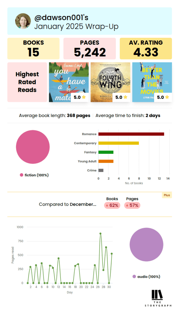 I started using Storygraph this year, and find it so much easier to navigate than Goodreads. I’m still trying to find readers to follow, however, so if you’re on StoryGraph, let’s be friends! If you’re new to StoryGraph, you can see just a small taste of the kind of statistics it tracks for users.